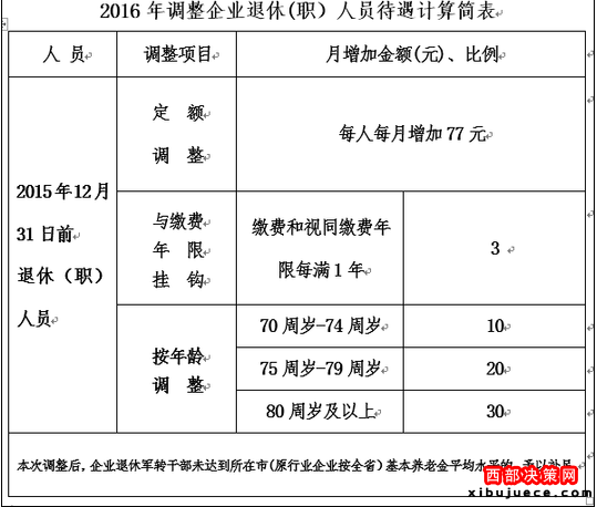 在2016年基本養(yǎng)老金調(diào)整中,定額調(diào)整和掛鉤調(diào)整后,再按年齡段適當(dāng)調(diào)整傾斜,陜西重點體現(xiàn)了對高齡(70歲及以上)退休人員的照顧。