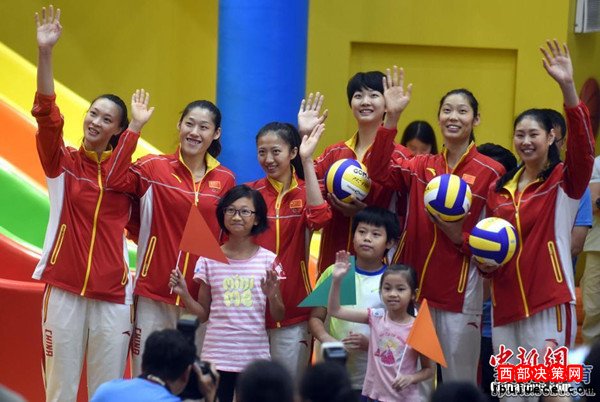 北京時間8月28日,女排隊員在香港與市民見面。見面會上女排姑娘與當?shù)貎和M行了互動游戲,女排主教練郎平幽默扮鬼臉令人捧腹大笑。