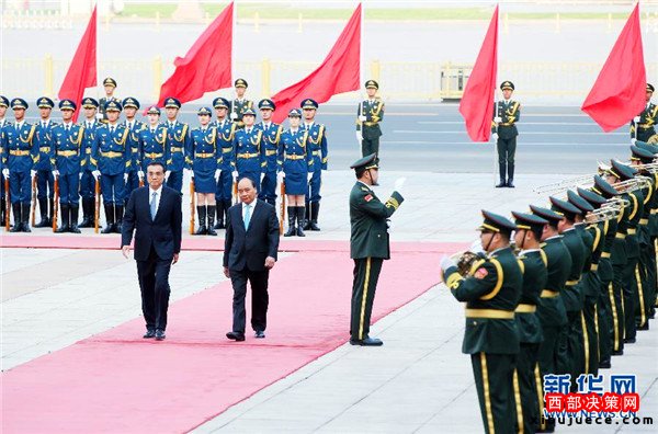 會(huì)談前,李克強(qiáng)在人民大會(huì)堂東門外廣場(chǎng)為阮春福舉行歡迎儀式。