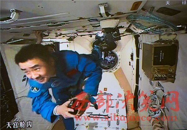 10月19日,神舟十一號(hào)航天員景海鵬和陳冬順利進(jìn)入天宮二號(hào)實(shí)驗(yàn)艙。這是景海鵬進(jìn)入天宮二號(hào)實(shí)驗(yàn)艙(攝于北京航天飛行控制中心大屏幕)。