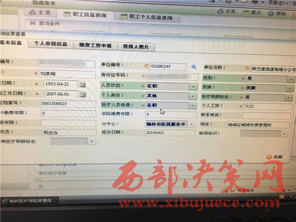 為了進(jìn)一步了解到底是陜西省交通集團(tuán)榆靖分公司紀(jì)委部造假還是陜蒙界收費(fèi)站職工(提供的考勤表上有明顯涂改痕跡,天數(shù)是28天)和站長自己(自敘錄音)一起造假。在合療辦調(diào)取查看的合療系統(tǒng)顯示,單位編號(hào)01000347,名稱陜交建高速榆靖分公司,劉某工資7123元。