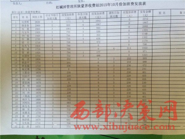 紀(jì)委王姓負(fù)責(zé)人告訴西部大開發(fā)雜志社記者菜價(jià)偏高確實(shí)從在,人已經(jīng)換掉,正在調(diào)查中,他們公司并未下過處罰,也未發(fā)現(xiàn)篡改考勤一事,不存在套取國家國有資金,并且給西部大開發(fā)雜志社記者拿出一塔資料,這就是陜蒙界收費(fèi)站的考勤表,西部大開發(fā)雜志社記者看到考勤表上確實(shí)沒有任何涂改痕跡,其中陜蒙界收費(fèi)站劉站長的上班天數(shù)也是23天。西部大開發(fā)雜志社記者想要查看工資發(fā)放表格時(shí),得到結(jié)果還是無權(quán)了解。