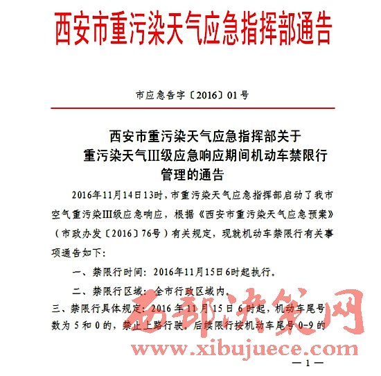 記者從西安市重污染天氣應急指揮部了解到,2016年11月14日13時,西安市重污染天氣應急指揮部啟動了西安市空氣重污染Ⅲ級應急響應。根據(jù)《西安市重污染天氣應急預案》(市政辦發(fā)〔2016〕76號)有關規(guī)定,現(xiàn)就機動車禁限行有關事項通告如下:
