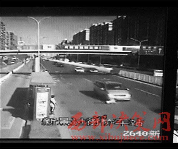 這段不到5秒鐘的視頻翻拍自事發(fā)現(xiàn)場的一個(gè)監(jiān)控?cái)z像頭,視頻正對的方向是一個(gè)公交站臺(tái)和機(jī)動(dòng)車道。