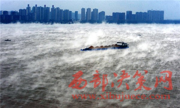 2016年11月23日,湖北武漢,寒潮帶來極速降溫后,由于江水溫度較大氣溫度高出不少,長江江面上出現(xiàn)層層水霧,煙波浩渺,蔚為壯觀,放眼望去,仿佛整個(gè)城市都漂浮在云霧之中。