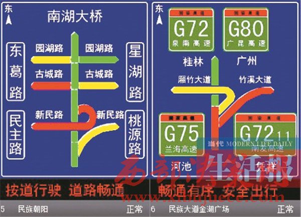 “至埌東客運(yùn)站旅行時(shí)間5分鐘”的提示,同時(shí)顯示周邊多條道路都是綠色……駕車在民族大道上會(huì)看到類似這樣的提示,這是南寧交警部門(mén)與高德地圖合作的成果。目前,高德地圖提供的實(shí)時(shí)路況交通信息已經(jīng)陸續(xù)上線南寧市交通誘導(dǎo)屏。在民族大道沿線的60塊誘導(dǎo)屏,均可以清楚地反映實(shí)時(shí)路況信息和道路擁堵?tīng)顩r。