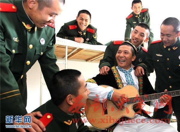 12月5日,艾麥爾·吾斯曼在訓(xùn)練之余為戰(zhàn)友們彈琴演唱。