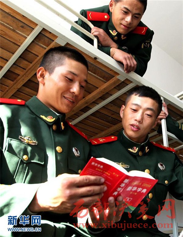 12月5日,艾麥爾·吾斯曼(左一)在連隊(duì)?wèi)?zhàn)友的幫助下學(xué)習(xí)漢語。