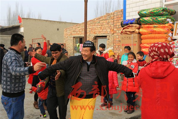 人逢喜事精神爽,女主人巴哈爾古麗·吾斯曼站在門口,滿面春風(fēng)笑迎每一位前來賀喜的客人,并不時踮腳伸長脖子向村頭路口張望——她還在等一位特殊的客人。