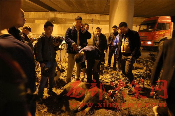 19:15,再次發(fā)現(xiàn)野豬蹤跡,它被狗攆著跑出了區(qū)政府大院,鉆到附近高速路橋下涵洞里。人群正準(zhǔn)備再次抓捕,一輛白色別克轎車駛過(guò),“二師兄”被撞出十多米遠(yuǎn),這下再?zèng)]起來(lái)。