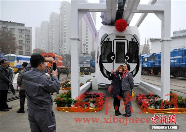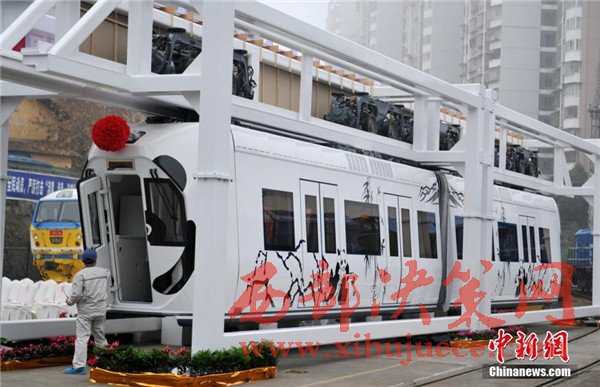 記者在現(xiàn)場看到,正式下線的空鐵車身為卡通熊貓山水圖案,酷似“熊貓”,每列定員144人,時速最高可達65公里。列車采用“大容量動力蓄電池充放電控制技術”,通過實現(xiàn)高倍率放電,提高列車起動加速性能及對極限環(huán)境的適應性,同時能將400千瓦的電制動功率全部用于動力電池快速充電,實現(xiàn)制動能量回收再利用,延長蓄電池續(xù)航里程達120千米。圖為車身外繪制有熊貓山水圖案。