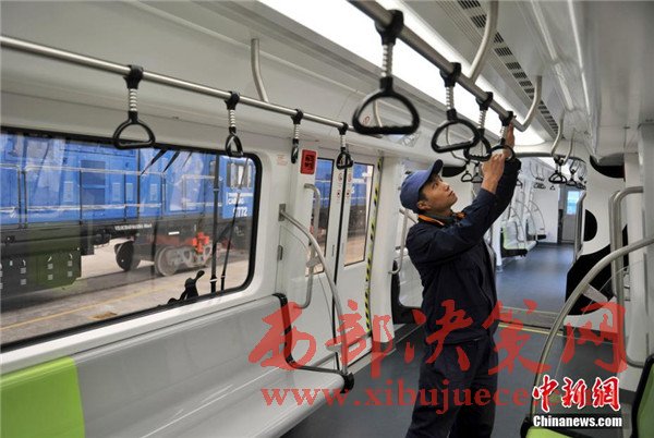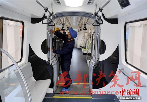 此外,列車整體結構也采用輕量化設計,全線無人駕駛,能像地鐵、動車組一樣靈活編組。列車在懸掛裝置設有兩級保護,還在駕駛室內(nèi)設有緊急逃生筒和故障救援門,可實現(xiàn)縱向、橫向及垂向的三維救援,確保了突發(fā)情況下乘客的安全。圖為車廂內(nèi)也繪有“熊貓”圖案。