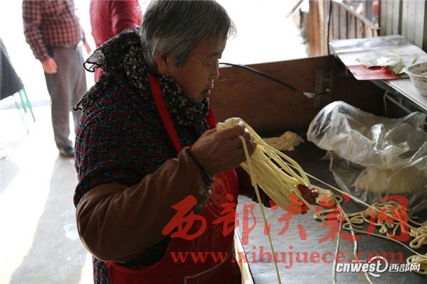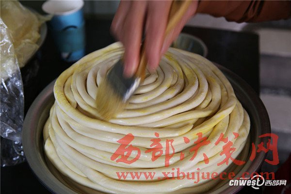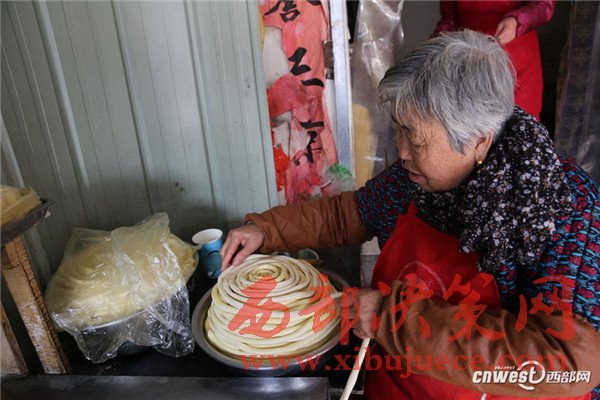 問賀玉蘭老人做得一碗好面有啥竅門,賀玉蘭老人說:“有啥竅門?實(shí)實(shí)在在做就成,一個是面要揉好、揉成光光亮亮的軟面團(tuán),揉好的面醒2個小時后就可以搓成粗條子盤放在盆子里,一層層碼放,刷上菜籽油,一個是防止面粘在一起,另外也能使面口感更爽滑,盤放好后再醒2個小時。”