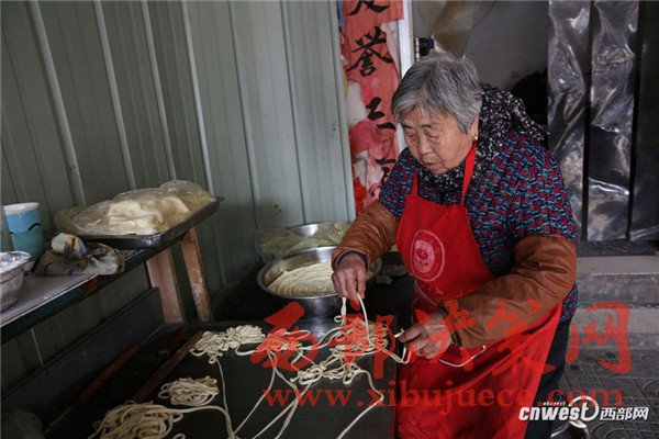 西安南二環(huán)附近的一條小巷里,新安醫(yī)院門口,70歲的賀玉蘭老人和兒媳劉艷寧在她們的實(shí)惠面館里忙碌著,揉面、拉條子、下面、給食客端面,婆媳倆默契得就像一個人,“二人成一心,黃土變成金。” 賀玉蘭老人喜歡老家蒲城的這句老話。