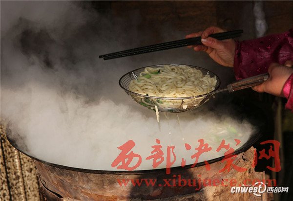 食客來了就可以將粗條面拉細(xì),拉細(xì)后像繞線一樣繞在手上,再在案板上摔打幾下讓面條變細(xì)變得更勻稱,就可以下鍋煮面了。和面要用溫水,只放一點(diǎn)點(diǎn)鹽,其它啥都不加。