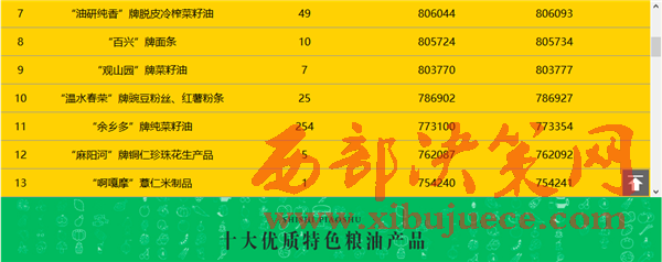 余慶縣大涼山米業(yè)有限責任公司的“大涼山”香米,貴州赫章縣黔豐蕎業(yè)有限公司的“黔豐”牌苦蕎系列產(chǎn)品,印江土家族苗族自治縣騰飛米業(yè)有限責任公司的“大圣墩”牌大米,貴州油研純香生態(tài)糧油科技有限公司的“油研純香”牌脫皮冷榨菜籽油,納雍縣百興鎮(zhèn)白泥屯特色產(chǎn)品有限公司的“百興”牌面條,貴州省貴定縣古鎮(zhèn)香糧油有限公司的“觀山園”牌菜籽油,習水縣春榮食品加工廠的“溫水春榮”牌豌豆粉絲、紅薯粉條七個產(chǎn)品也憑借優(yōu)異的表現(xiàn)躋身前十。遵義地區(qū)糧油產(chǎn)品占據(jù)前十名三個席位,黔南、畢節(jié)、銅仁各有兩個糧油產(chǎn)品躋身前十,六盤水一個產(chǎn)品入圍十強。