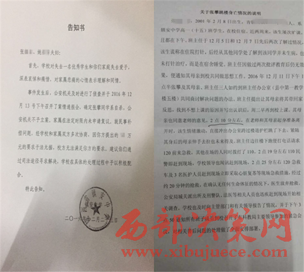 據(jù)墜樓學(xué)生張某母親姚女士悲傷地說(shuō):“我兒子于2016年中考以優(yōu)秀的成績(jī)考入高中分在高一(15)班,他從小聽(tīng)話、好學(xué),在小學(xué)、初中名列前茅,因此在高中表現(xiàn)突出,出任班長(zhǎng)、團(tuán)支部書(shū)記,在校期間學(xué)習(xí)認(rèn)真;在入學(xué)期間中考進(jìn)步明顯由700多名進(jìn)步到305名。自8月20日高中新學(xué)年開(kāi)學(xué)以來(lái),鎮(zhèn)安縣高中長(zhǎng)時(shí)間利用節(jié)假日補(bǔ)課,我兒子連續(xù)四周沒(méi)回家,由于天氣變化感冒,曾向老師請(qǐng)假打針,可因?yàn)殄X不夠、沒(méi)時(shí)間回家取,白天上完課體力不支、趁晚自習(xí)在宿舍休息、連續(xù)幾天如此;老師沒(méi)向家長(zhǎng)反映,也沒(méi)了解孩子的身體狀況。于2016年12月11日早我接到班主任(祁某虎)電話,讓我到學(xué)校談話、我下午一點(diǎn)左右到鎮(zhèn)安縣中;由我兒子帶到班主任辦公室,路途中我兒子還再三叮囑我、讓我給班主任說(shuō)好話;在班主任辦公室祁某虎說(shuō)了我兒子的情況;①?gòu)埬惩瑢W(xué)由中考七百多名進(jìn)步到三百零五名,學(xué)習(xí)成績(jī)進(jìn)步明顯;②在班上表現(xiàn)突出,出任班長(zhǎng)、團(tuán)支部書(shū)記,是一個(gè)好學(xué)生;③在本周連續(xù)曠課,需回家反省、停課三天。我讓兒子給班主任當(dāng)面講清為什么曠課,班主任堅(jiān)持的說(shuō):‘我不想知道原因,因?yàn)槟愫逦因_我,你態(tài)度惡劣必須嚴(yán)肅處理,不然在班上難以服眾、無(wú)法管理其他學(xué)生;必須回家停課、反省、寫保證書(shū),一份給父母、一份給老師、一份自己留著并在全班讀,要夾在書(shū)里天天看’;孩子不想回家要上學(xué),不想停課誤了學(xué)業(yè)懇求道:‘我在學(xué)校寫保證書(shū),一定會(huì)端正態(tài)度’。孩子再三請(qǐng)求無(wú)果,我也懇求留下孩子,可是班主任始終態(tài)度堅(jiān)決,并起身說(shuō):‘你不走、我走,不回家反省、不用來(lái)上學(xué)’。我兒子攔住班主任準(zhǔn)備下跪請(qǐng)求,班主任訓(xùn)斥道:‘張某、你想咋地’,我兒子說(shuō):‘老師你錯(cuò)了’,可是班主任依然堅(jiān)持;然后我兒子走投無(wú)路用無(wú)助的目光環(huán)視了我一下,轉(zhuǎn)身就沖出去從五樓跳下;事發(fā)后班主任依然無(wú)動(dòng)于衷,也沒(méi)有及時(shí)報(bào)警;當(dāng)時(shí)一高三學(xué)生說(shuō):‘趕快報(bào)警’,一老師說(shuō):‘這沒(méi)你的事趕快回教室’。事后學(xué)校第一次與親屬談話;城關(guān)派出所通報(bào)了案情,班主任祁某虎講述了事情經(jīng)過(guò)說(shuō)他讓我兒子回家反省,是他的一貫教學(xué)手段;他作為班長(zhǎng)行為惡劣,不拿他作為教育榜樣,無(wú)法教育好其他學(xué)生,有起殺一儆百的作用。第二次談話說(shuō),家屬要求給一個(gè)交代、追究相關(guān)人責(zé)任,學(xué)校最后表面管的稱;①不怕家屬上訪、②不怕借助媒體報(bào)道討說(shuō)法、③不怕經(jīng)過(guò)司法來(lái)告狀。在此期間我們找過(guò)主管教育的朱縣長(zhǎng)稟明此事,朱縣長(zhǎng)表示沒(méi)有接到真實(shí)上報(bào),對(duì)事情不了解,他會(huì)嚴(yán)肅處理、并電話責(zé)令龍校長(zhǎng)嚴(yán)格對(duì)待處理此事??墒鞘嗵爝^(guò)去,學(xué)校依然沒(méi)有任何處理,態(tài)度強(qiáng)硬、用各種手段施壓;至25日14時(shí),學(xué)校給我們親屬安排在鎮(zhèn)安縣開(kāi)元酒店的房子,也責(zé)令酒店收回將我們都趕出來(lái)了,在這雪雨交加的天氣我們?cè)摵稳ズ螐?,孩子的遺體還在殯儀館我們?cè)撛趺崔k”。