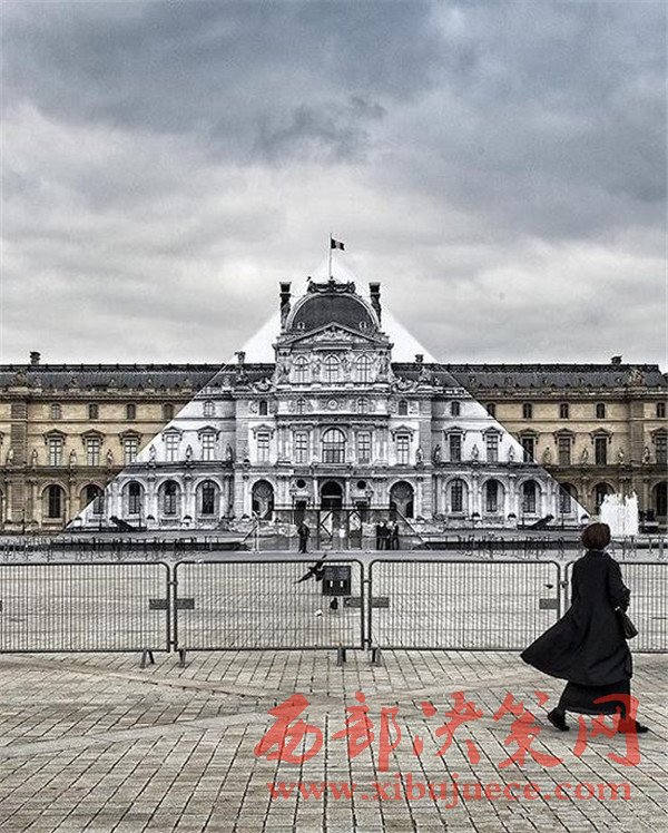 利用攝影技術(shù),法國街頭藝術(shù)家JR讓巴黎盧浮宮前著名的玻璃金字塔消失了。當(dāng)從一個精確的角度看過去,金字塔真的不見了,我們得以見到盧浮宮驚人的“真面目”。