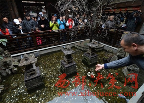 中午時分,記者又一次仔細觀察了水池,在游人拋投硬幣時,確實有一兩條金色的觀賞魚在石縫處游動著。在木制欄桿四周,正貼著“禁止倚靠欄桿”、“禁止投幣”等字樣。“春節(jié)游客爆滿,水池是從寬巷子到窄巷子的必經(jīng)之道,加上很多人在拋硬幣,頓時人滿為患。我們只好打印了幾張?zhí)嵝褟堎N起來。”辦公室工作人員還表示,“等春節(jié)游客潮稍微退卻,天氣回暖,我們就要派人下水打撈這些硬幣,用于景點建設。”