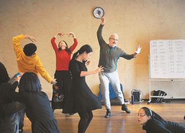 茲維卡(右)指導(dǎo)學(xué)員伴隨著音樂的節(jié)拍進(jìn)行舞動。