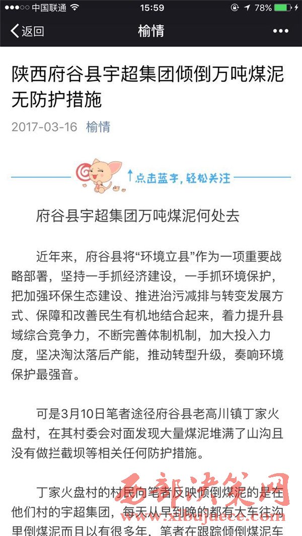 3月13日筆者又來到府谷縣環(huán)保局又將此事反映給了王局長,王局長于本局監(jiān)察大隊(duì)楊副隊(duì)長溝通后說此事正在調(diào)查,下午楊隊(duì)長會(huì)給筆者回復(fù)調(diào)查結(jié)果。