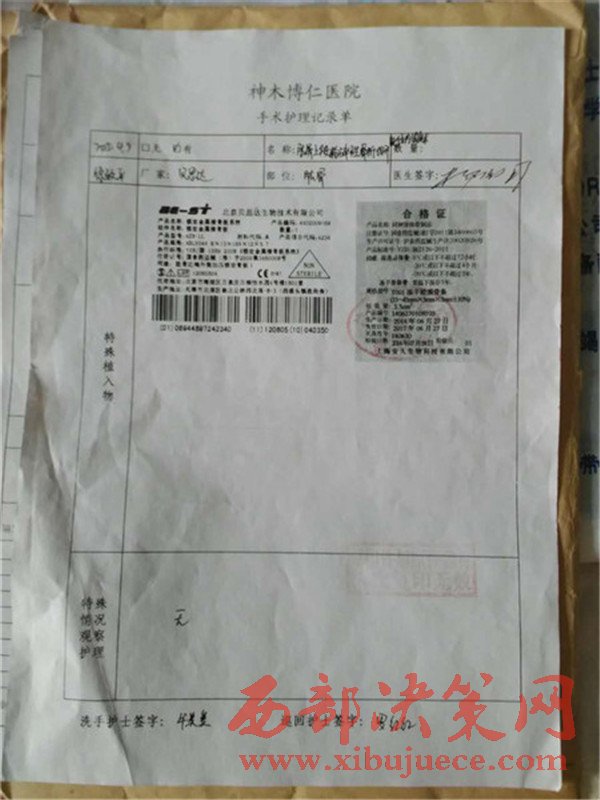 患者家屬將原來(lái)在博仁醫(yī)院住院的資料全部拿出來(lái)時(shí)發(fā)現(xiàn),大保當(dāng)博仁醫(yī)院當(dāng)時(shí)給患者做手術(shù)所用的鋼板可能存在問(wèn)題,做手術(shù)所用的鋼板與當(dāng)時(shí)給患者提供的合格證書(shū)不符,在此期間家屬也找過(guò)原博仁醫(yī)院劉院長(zhǎng),所給的答復(fù)是他剛來(lái)不知道此事,董事長(zhǎng)(賀玉剛)也說(shuō)是在西安,你們先看病,回頭把鋼板拿過(guò)來(lái),等鋼板廠家的人來(lái)了,我們?nèi)阶谝黄鹂丛趺唇鉀Q,就這樣一直拖著直到現(xiàn)在。