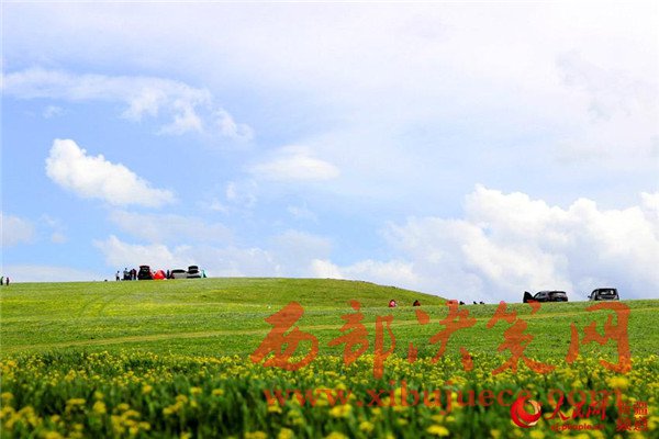 5月29日,游客在新疆裕民縣巴爾魯克山風景區(qū)阿克喬克草原踏青賞花。