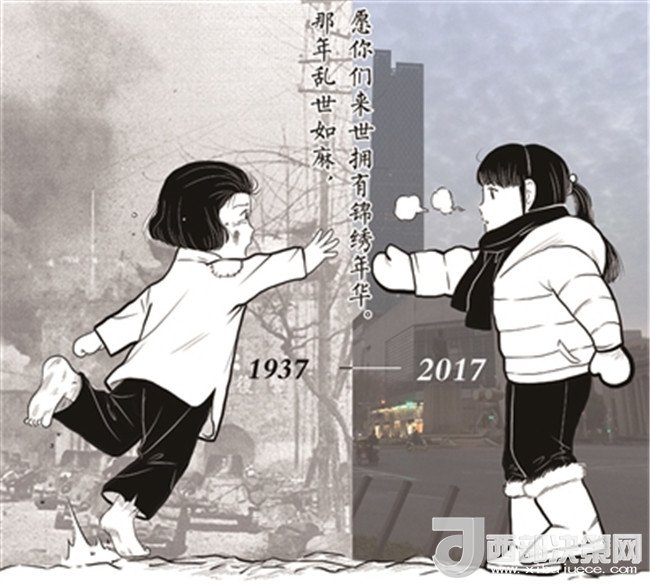 12月13日,南京大屠殺死難者國家公祭日,這一天,許多人的微博和朋友圈被一張圖片刷屏。在圖里,一名來自1937年的女孩和一名來自2017年的女孩隔空相對(duì),彼此伸出手想要抓住對(duì)方。其中1937年里的女孩全身是灰,衣服單薄,光著雙腳,她的身旁是槍火留下的煙塵和戰(zhàn)爭(zhēng)留下的荒亂;而2017年里的女孩穿著暖和的棉服,在她身后,是現(xiàn)代的高樓和干凈的街道。兩人的中間寫有一行字,“那年亂世如麻,愿你們來世擁有錦繡年華”。
