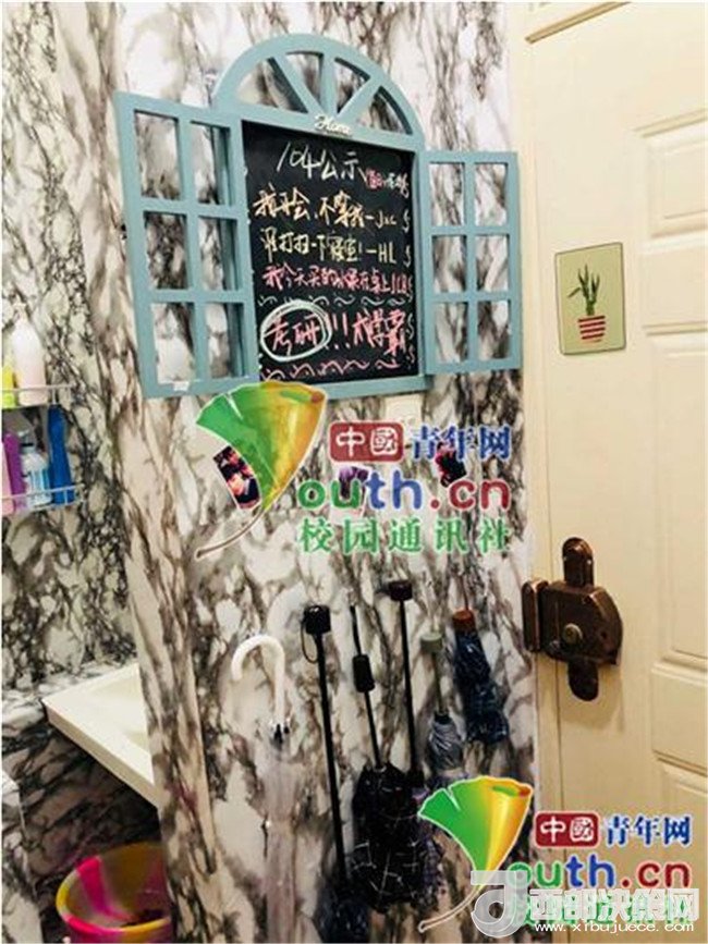 記者了解到,華麗變身后的宿舍,除了效果讓人驚艷不已外,還有許多小細(xì)節(jié)同樣讓人覺(jué)得很暖心。在門(mén)口處有一個(gè)小黑板,上面寫(xiě)著室友的留言和一些鼓勵(lì)的話(huà)語(yǔ);進(jìn)門(mén)的地方專(zhuān)門(mén)騰出一塊空間,放雨傘、鑰匙等一些物品。