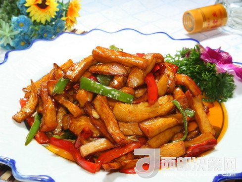 3. 炒鍋上火,加入花生油燒熱,放蔥絲爆鍋,加入干辣椒炒香,再加入青紅椒絲、土豆絲,炒至八成熟時加入精鹽、味精調(diào)味,再淋上香油和香醋,炒熟即可。