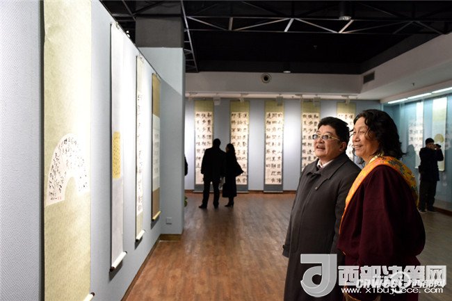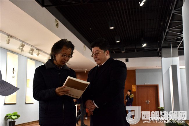 西安工業(yè)大學(xué)黨委副書記于孟晨、甘肅省書協(xié)副主席王青彥一同觀看“和天下”書法展。
