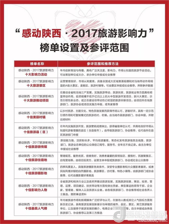 “感動陜西·2017旅游影響力”大型評選活動,既是對2017年陜西旅游業(yè)的綜合評估和優(yōu)勢品牌項(xiàng)目的一次集中梳理和聯(lián)動推廣,評選活動設(shè)置了2017年“十大影響力活動”、“十大旅游景區(qū)”、“十大旅游推動力項(xiàng)目”、“十佳美麗村鎮(zhèn)”、“十佳旅游縣(區(qū))”、“十佳旅游微傳媒”、“十佳旅游住宿地”、“十佳旅游攝影地”、“十佳影響力人物”、“十佳最具人氣榜”10類項(xiàng)目,采取社會推薦、自主申報(bào)、專業(yè)推選、游客調(diào)查、網(wǎng)民評選、社會公示、大眾點(diǎn)評、數(shù)據(jù)分析等方法得出評選結(jié)果,于2018年1月通過大型盛典對外公布,使其成為載入史冊的2017年度陜西旅游業(yè)優(yōu)勢品牌榜單。