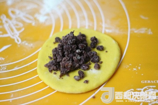 5、取其中一個(gè)面團(tuán)搟成小圓形,放入適量蜜豆。