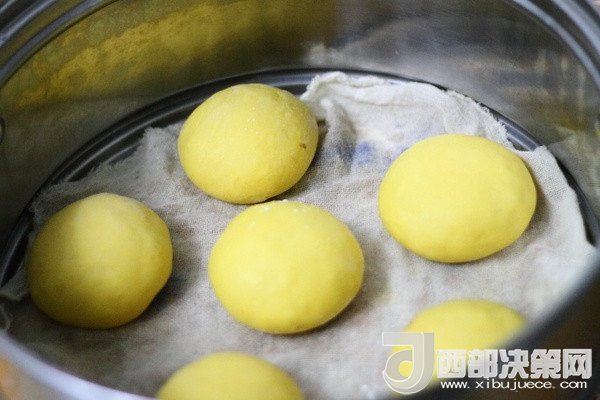 7、重復(fù)上述步驟做剩余的蜜豆包,全部做完后放蒸鍋中放置10—15分鐘左右,煤氣灶開(kāi)火燒水,待水燒開(kāi)后將蜜豆包放上去蒸15分鐘左右關(guān)火。