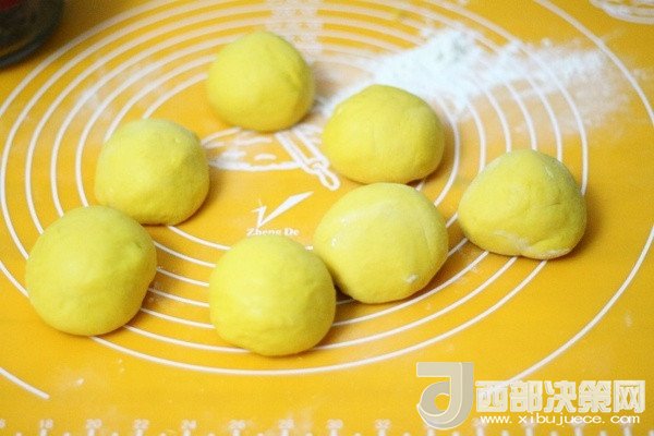 4、發(fā)酵的面團(tuán)再次揉光滑,平均分成7個(gè)小面團(tuán)。