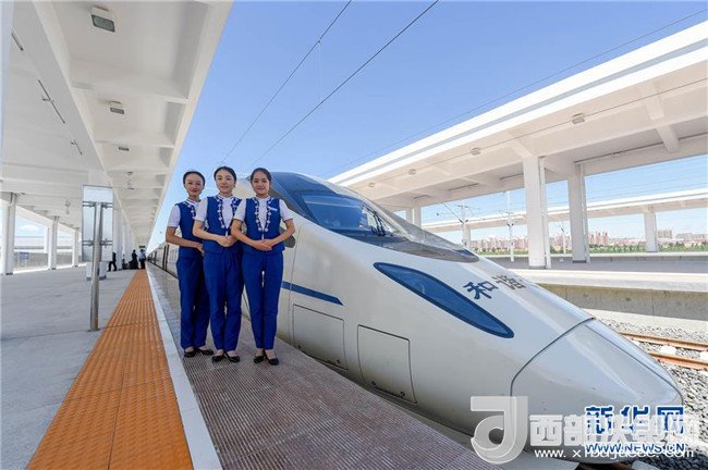 乘務(wù)組人員在烏蘭察布站與動車組合影(8月3日攝)。8月3日,內(nèi)蒙古首列高鐵D6980次列車伴隨著嘹亮的汽笛聲,駛出呼和浩特東火車站,以250公里的時(shí)速駛向?yàn)跆m察布站,內(nèi)蒙古自此正式邁進(jìn)高鐵時(shí)代。