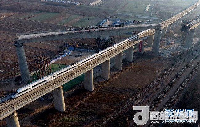 12月19日,一列高鐵從轉(zhuǎn)體成功后的商合杭高鐵跨鄭徐高鐵T構(gòu)梁下駛過。商合杭高鐵線路全長794.55公里,設(shè)計(jì)時(shí)速350公里。