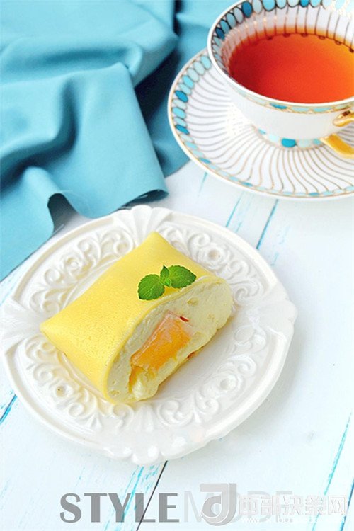 6.攤好皮冷卻后用勺子盛入適量打發(fā)的淡奶油,再加入一塊芒果肉,折疊成四方狀,收口朝下,完工。