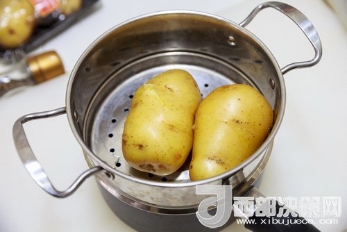 土豆放進(jìn)入蒸鍋蒸熟(用筷子能輕松插入的程度),晾涼后剝?nèi)テぁ?/p>