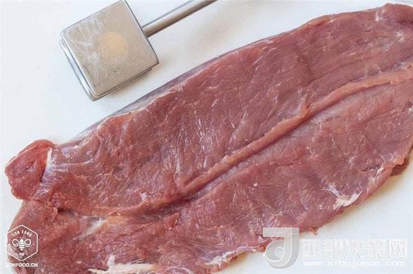 4、將農畉豬里脊肉沿邊緣切開,像一本書一樣打開,先用保鮮膜覆蓋,再用木槌或搟面杖輕輕敲打,直到它厚度均勻;