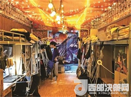 12月28日,劉清帶著記者來到中國傳媒大學(xué)生活區(qū),走進(jìn)他們改造后的宿舍。宿舍位于6層,記者進(jìn)去時(shí),劉清的兩位室友正坐在自己的吊椅上打游戲。與其他的宿舍不同,這間宿舍的墻壁上貼滿了壁紙,天花板上布滿了一串串LED小燈泡。四人告訴北青報(bào)記者,他們從來不開宿舍原來配置的日光燈,都是用LED燈照明。記者注意到,這些小燈上面,罩著一層紫紅色紗幔。