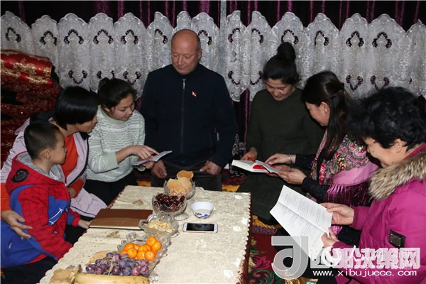 2017年12月30日,新疆吐魯番市托克遜縣第一中學(xué)三名任課教師來到初三學(xué)生蘇爾婭·巴克爾(左三)家中開展“住家式”家訪,同吃同住同學(xué)習(xí),共學(xué)黨的十九大精神。阿爾達(dá)克 攝