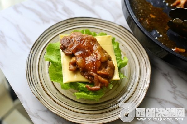 1、將冷卻好的面包胚從中間切開,然后放入生菜、芝士片、照燒雞腿和沙拉醬就好。