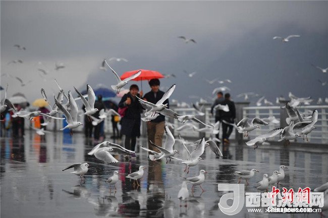 1月3日,紅嘴鷗在滇池邊與游客親密接觸。當日,“春城”昆明淅淅瀝瀝的小雨下個不停,仍有眾多游客和市民來到滇池邊,與西伯利亞的“白色精靈”——紅嘴鷗相會,領(lǐng)略昆明別樣美景。(記者 劉冉陽 攝)