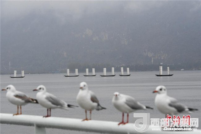 1月3日,排排站的紅嘴鷗與遠處的帆船相應(yīng)成趣。(記者 劉冉陽 攝)