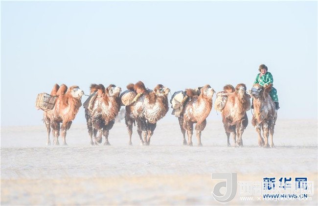 1月9日,牧民騎著駱駝行走在白雪茫茫的蘇尼特草原上。記者 連振 攝
