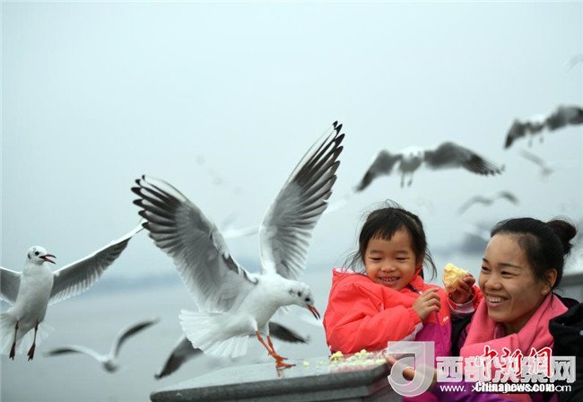 2月4日,一名女孩在昆明滇池邊給紅嘴鷗喂食。當日,受較強冷空氣影響,“春城”昆明最低氣溫下降至-3℃。天氣雖然寒冷,卻抵擋不住市民和游客前來滇池觀賞、喂食越冬紅嘴鷗的熱情。中新社記者李進紅攝