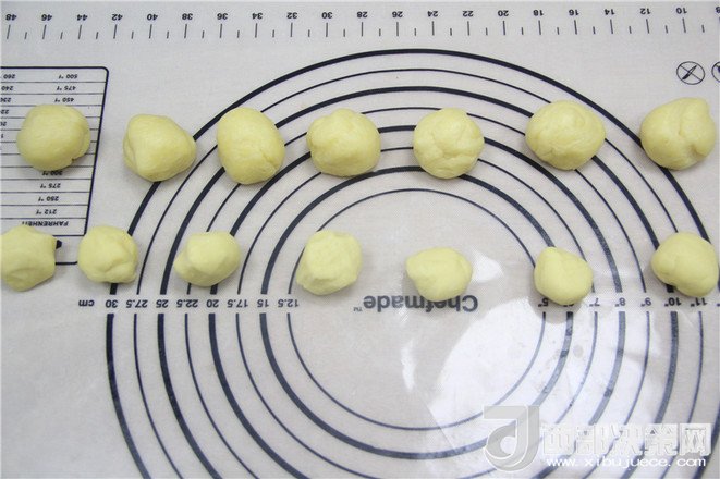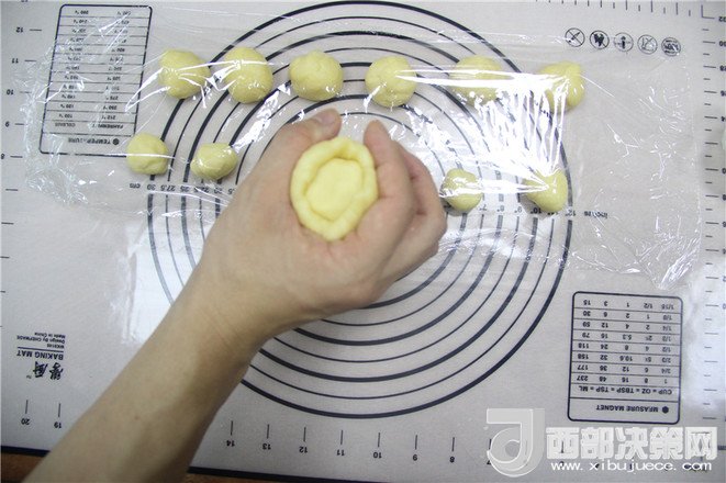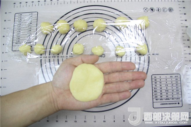 11.把油皮分割成6個(gè)25克,油心分成6個(gè)20克,分別揉成團(tuán)。