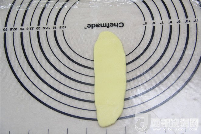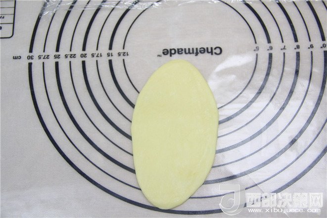 18.油酥面團(tuán)直立放著,然后用搟面杖搟成長(zhǎng)條橢圓。