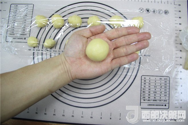 12.把油皮球用掌心均勻的向四周搟開(kāi)成皮。